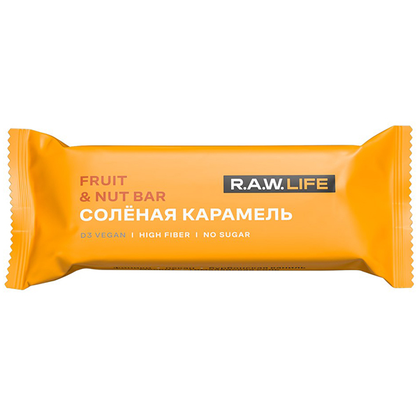 R.A.W. LIFE – натуральный батончик на основе фиников особого сорта и цельных орехов. Все ингредиенты команда R.A.W. LIFE тщательно отбирает со всего мира, используя только качественные продукты. Батончик Соленая карамель — это отличная альтернатива сладостям, которые всегда так хочется. Батончики изготовлены из натуральных и полезных продуктов, богат антиоксидантами. В основе используются финики особого сорта родом из ОАЭ и Саудовской Аравии. Финики высушены прямо на ветках пальмы под лучами южного солнца. Поэтому у них такой легкий карамельный вкус. Без добавок и термической обработки. Используются отборные орехи высшего сорта. В батончик попадают крупными кусочками без термической обработки. Чилийский пекан — редкий и экзотический орех. Его широко используют в кулинарии для приготовления десертов. Перуанский кэроб это сладкий порошок из стручков мескитового дерева, которое растет на территории центральной и южной Америки. Порошок получают путем просушки бобов, благодаря чему он получает сладковатый вкус. Лучший сорт прямиком из Мадагаскара. Используются настоящие ванильные стручки, которые перемалывают в порошок темного цвета с очень насыщенным ароматом. В производстве не используется заменитель ванили. Розовая соль добывается преимущественно в гималайских горах вручную и затем высушивается на солнце. Без добавления сахара, консервантов, красителей, ароматизаторов. Подходят вегетарианцам.