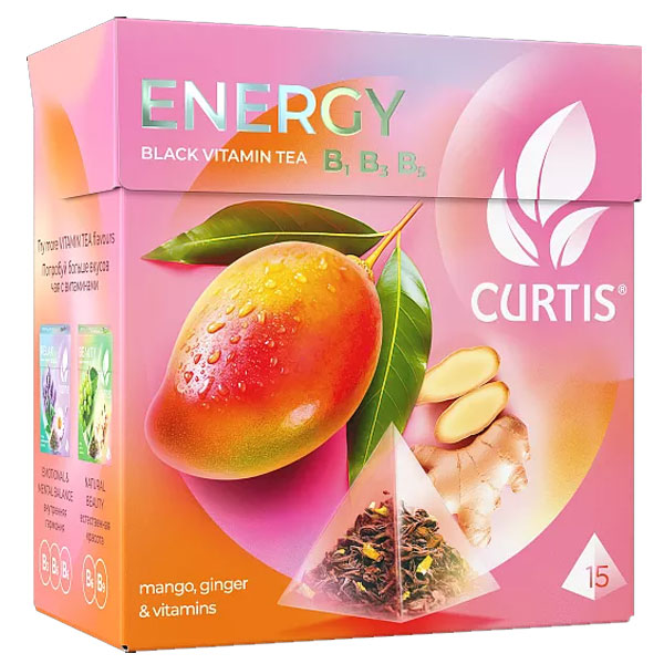 Ароматизированный чай CURTIS Energy в пирамидках – черный листовой чай, обогащенный витаминами В1, В3, В5. Польза манго, кусочки имбиря, цедра цитрусовых и сила витаминов способствуют поддержанию жизненной энергии. Насладись многогранным вкусом для активной жизни.