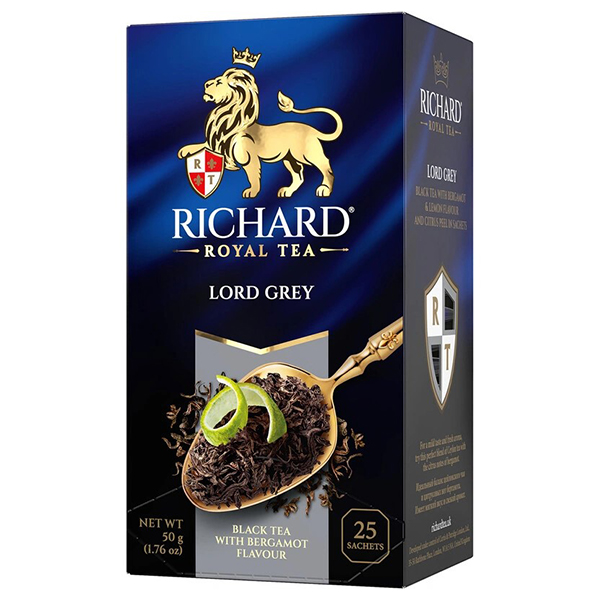 Richard Lord Grey - черный байховый цейлонский чай в пакетиках с ароматом бергамота и лимона, а также цедрой цитрусовых фруктов. Неповторимый букет цейлонского чая с чарующей нотой бергамота станет фаворитом важных светских раутов.