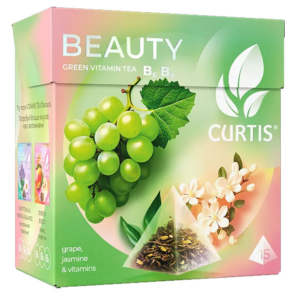 Ароматизированный зеленый чай CURTIS Beauty в пирамидках – китайский зеленый листовой чай, обогащенный витаминами В6, В9. Антиоксиданты зеленого чая, кусочки винограда и сила витаминов способствуют поддержанию красоты и молодости. Насладись чашкой чая CURTIS Beauty с изысканным ароматом для естественной красоты.