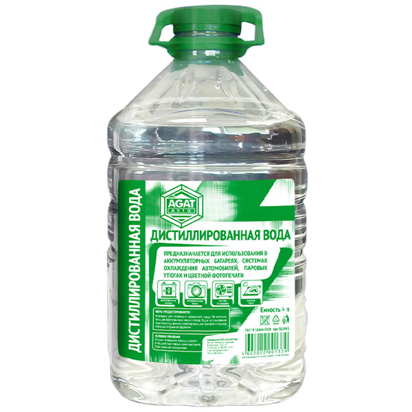 Применяется для технических и бытовых целей в аккумуляторных батареях, в системах охлаждения автомобилей, в паровых утюгах, в цветной фотопечати и т. д. Дистиллированная вода под торговой маркой «АГАТ» отвечает жестким требованиям ГОСТа. Удельная электрическая проводимость при t=20 : 3,4*10-4