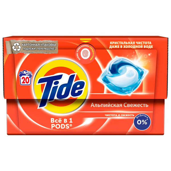 Капсулы для стирки Tide Все-в-1 Альпийская свежесть, 20шт - это инновационное средство для очищения одежды и белья, состоящее из 3 секций, в каждой из которых находятся отдельные компоненты. При контакте с водой во время стирки инновационная пленка капсулы растворяется и ингредиенты смешиваются, начиная сразу действовать. Точная дозировка позволяет отстирать целый барабан вещей всего одной капсулой. Специальная усиленная формула удаляет даже стойкие пятна и сохраняет белье белоснежным от стирки к стирке. Капсулы легко использовать, ведь ничего не нужно дозировать. Подходят для стирки даже в холодной воде от 20С. Не содержат кондиционер для белья. Продукт может быть опасен. Берегите капсулы Tide от детей.