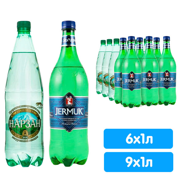 В состав комплекта входят воды Джермук 1 л (6 шт. в упаковке) и Нарзан Тэсти 1 л (9 шт. в упаковке).