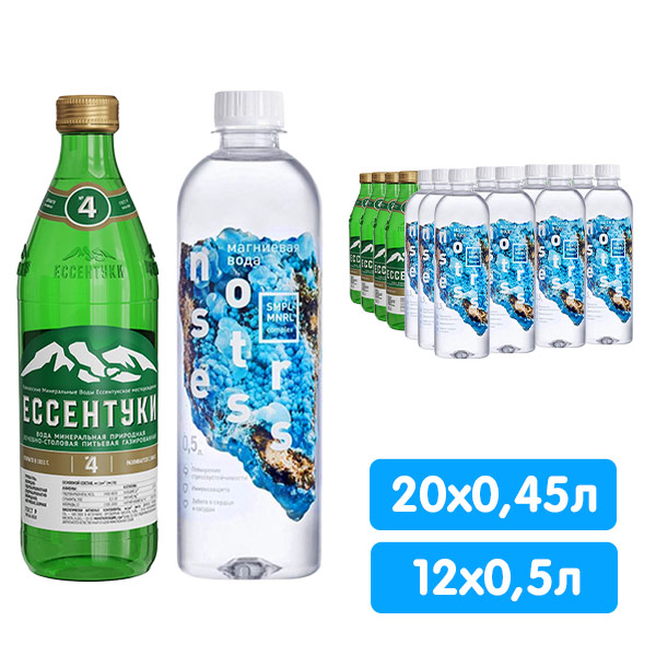 В комплект «STOP Стресс» входит лечебно-столовая вода «Ессентуки» 0,45 л. (20 шт. в упаковке) и минеральная магниевая вода «Лонгавита магний+калий» 0,48 л (14 шт. в упаковке).