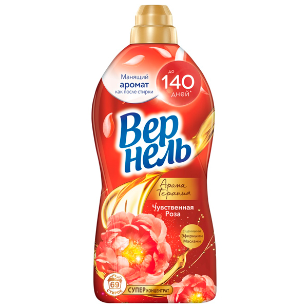 Концентрированный кондиционер для белья Vernel Ароматерапия Чувственная роза 1740мл подарит Вашему белью не только невероятную мягкость, но и чувственный аромат розы, а благодаря специальным аромакапсулам в составе кондиционер для стирки Vernel позволит наслаждаться интенсивным ароматом белья до 140 дней. Кондиционер для белья Vernel Ароматерапия также содержит в составе эфирные масла, которые подарят Вам вдохновение для души и тела.