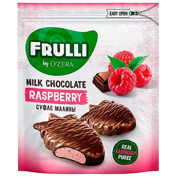 Корпус конфет из настоящего молочного шоколада O'Zera Extra milk, в его составе какао из отборных какао-бобов и цельное сухое молоко. Суфле приготовлено на основе пюре малины и сока, что делает его вкус максимально натуральным, насыщенным и узнаваемы.