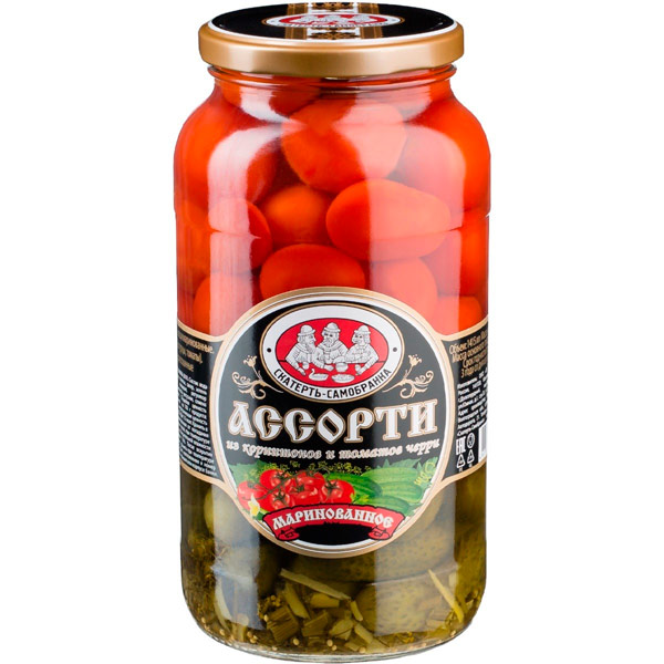 Ассорти маринованное из корнишонов и томатов черри Скатерть-Самобранка, 1415 мл приготовлено по домашнему рецепту консервирования овощей. В составе только натуральные ингредиенты. Продукт станет удачной закуской к столу.
