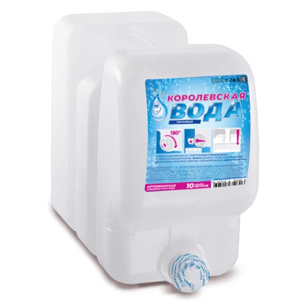 Питьевая «Королевская вода» разливается в удобные 10-литровые канистры с краником, которые можно брать с собой в поездки за город большой компанией. Кроме того, это идеальный домашний формат для тех, кому 5 литров мало, а 19 – много.