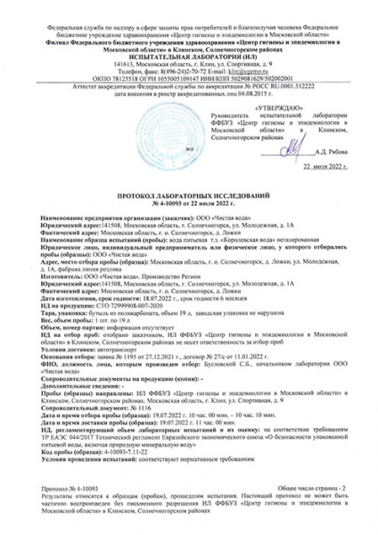По результатам лабораторных исследований, питьевая «Королевская вода» прошла проверку на соответствие требованиям качества и безопасности пищевой продукции.