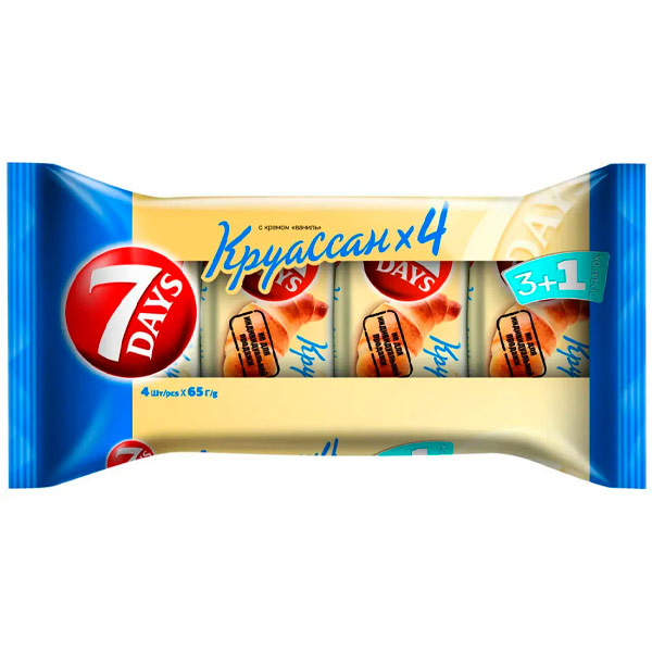 Круассан 7 days - это 4 порции вкусной и ароматной выпечки с нежным ванильным кремом. Легкое, воздушное тесто в сочетании со вкусом мягкого сливочного крема не оставит равнодушным ни одного сладкоежку. Утренний или послеобеденный перерыв на чашечку кофе с ароматным круассаном подарит настоящее наслаждение и зарядит отличным настроением на весь день.