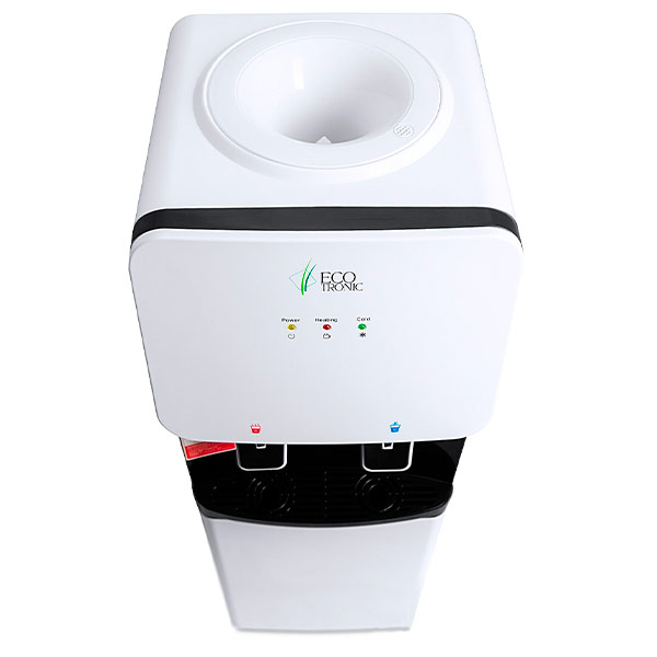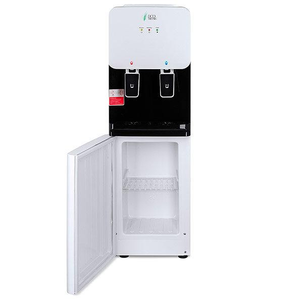 Компактный кулер для воды с функциями нагрева и охлаждения. С небольшим шкафчиком в нижней части. Электронное охлаждение. Корпус белого цвета с черной вставкой в области кранов подачи воды. Индикация режимов нагрева, охлаждения и готовности воды. Краны «нажим кружкой».