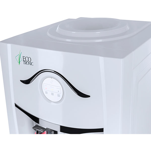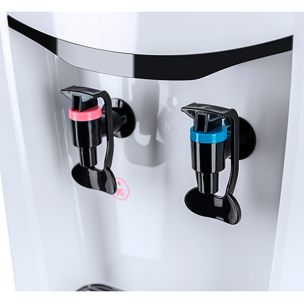 Напольный кулер со шкафчиком. Электронное охлаждение. Корпус белого цвета с черной глянцевой вставкой лицевой панели. Шкафчик для хранения. Краны нажим «кружкой». Индикация на лицевой панели. Отдельные выключатели на нагрев и охлаждение на задней стенке. Бак горячей воды 0,8 л, бак холодной воды 0,6 л.