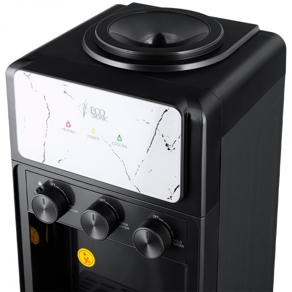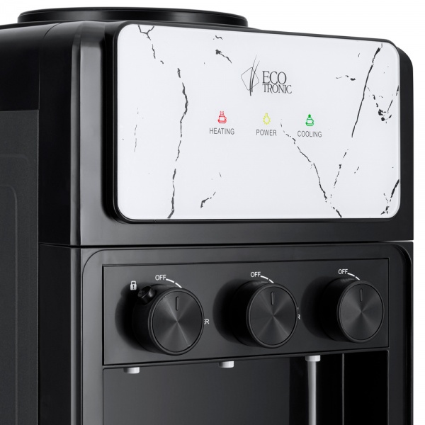 У кулера Ecotronic K25-LCE black Marble три температурных режима: «горячий», «холодный» и «комнатной температуры». Выдача воды производится поворотным механизмом.