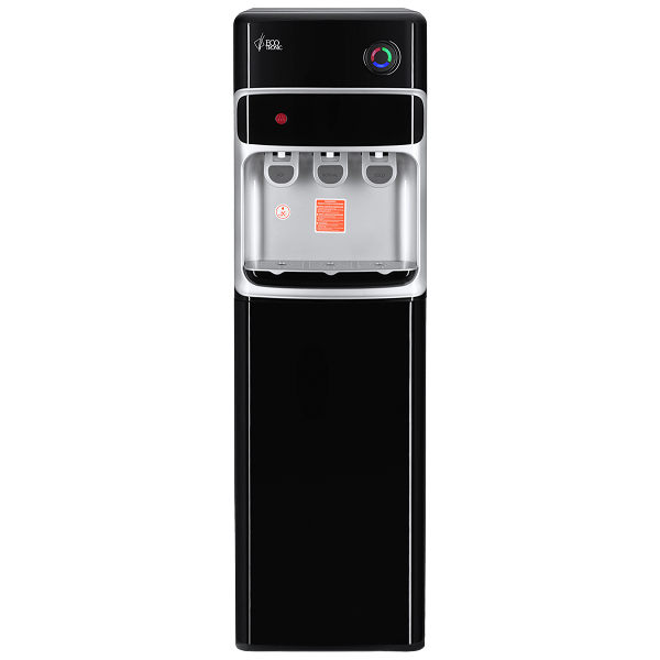 Напольный кулер с нижней загрузкой и электронным охлаждением. Три крана подачи воды типа "нажим кружкой": для подачи горячей воды, холодной и комнатной температуры (из бутыли). Защита на кране горячей воды. Корпус черного цвета с серебристой вставкой в области зоны подачи воды. Светодиодные индикаторы работы, нагрева и охлаждения сгруппированы в один блок круглой формы в верхней части передней панели.