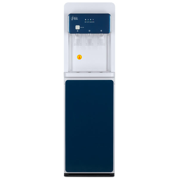 Эффектный дизайн позволяет вписать кулер в интерьер современного офиса: бутыль с водой полностью скрыта в нижнем отсеке, дверца которого имеет глянцевую стеклянную поверхность. Корпус белого цвета с синими вставками на передней панели.