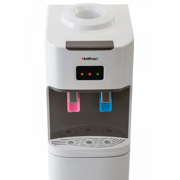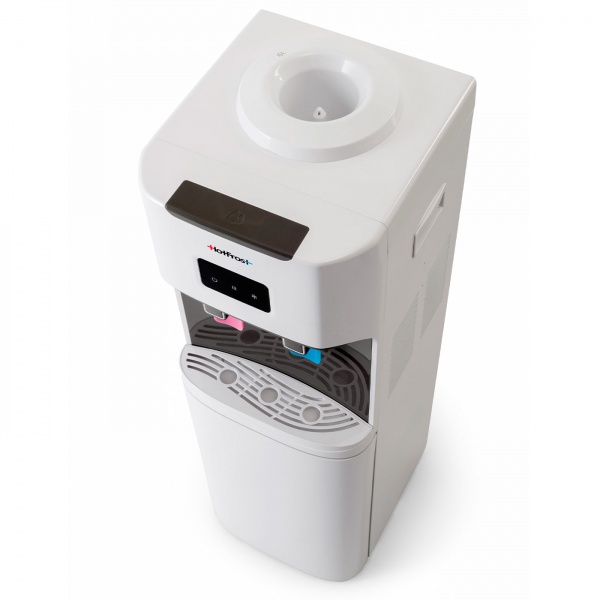 Новая модель с компрессорным охлаждением - HotFrost V115. Высота кулера V 115 в 1 метр наиболее эргономична для европейских людей среднего роста. При замене бутыли её не придётся поднимать слишком высоко, в то время как и не придётся низко наклоняться для налива воды в стакан. Мощность нагрева 650 Ватт позволяет получить до 5.5 литров воды в час температуры, достигающей 90С°. Компрессорное охлаждение этого аппарата производит до 2 литров в час холодной воды 5-7С°.