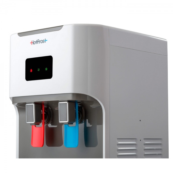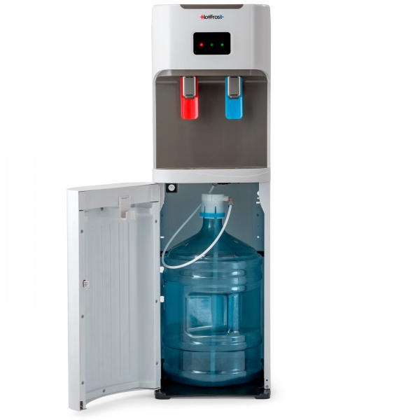 В кулере используется термоэлектрический тип охлаждения. Более высокая мощность нагрева делает этот аппарат гораздо производительнее, ведь он способен нагревать до 5.5 литров воды в час. Отличительной особенностью и явным преимуществом в пользу этого девайса является нижняя загрузка бутыли. Бутыль с питьевой водой устанавливается в шкафчик, на горлышко бутыли надевается встроенный сифон с заборной трубкой, а Вам остается только наблюдать за индикатором наличия воды. Такой диспенсер существенно облегчит Вашу жизнь!