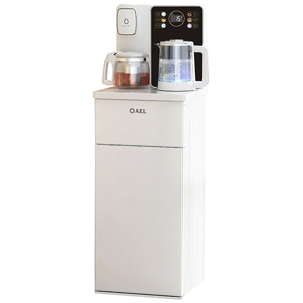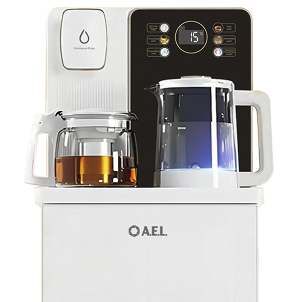Чайный столик белого цвета TB83a-LD с электронным охлаждением. Нижняя загрузка бутыли. Управление с помощью сенсорной панели управления и сенсорных кнопок на столешнице. Шесть режимов нагрева воды, маркированные температурой: 45°С для детской молочной смеси, теплая вода 60°С, холодная вода 15°С, 90°С для кофе, 100°С кипяток, и функция поддержания температуры 40°-90°С. Уникальная система залива воды непосредственно в чайник снизу через клапан в столешнице. Функция подогрева. Чайники объемом 1л, Размер электрического чайника: D 14 см, высота 17,2 см. Размер стеклянного чайника: D 12,5 см, высота 13 см.