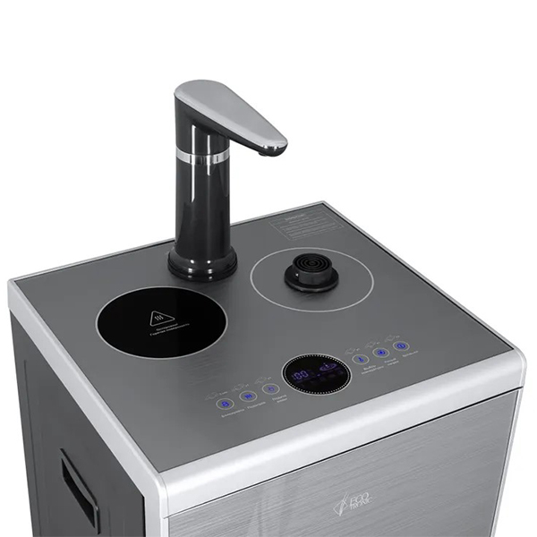 Нижняя загрузка бутыли на удобную выкатную полку. Два чайника — для кипячения ( 1 л.) и заварочный ( 1 л.). Нагрев воды в чайнике до 100°С. На столешнице расположена сенсорная панель управления на русском языке с индикацией работы аппарата. Столешница матовая, с нескользящим покрытием. Стеклянная передняя панель.