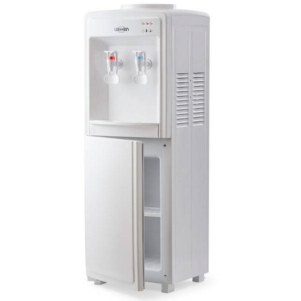 Стандартный напольный электронный кулер для воды бюджетного уровня. Со шкафчиком. Для дома. Для офиса. Современный дизайн. Цвет корпуса белый, все панели изготовлены из качественного, устойчивого к ультрафиолету пластика. Два крана-рычага. Подается горячая и холодная вода. Пригоден для эксплуатации в очень жарком климате - температура эксплуатации кулера от 10 до 38 градусов Цельсия.