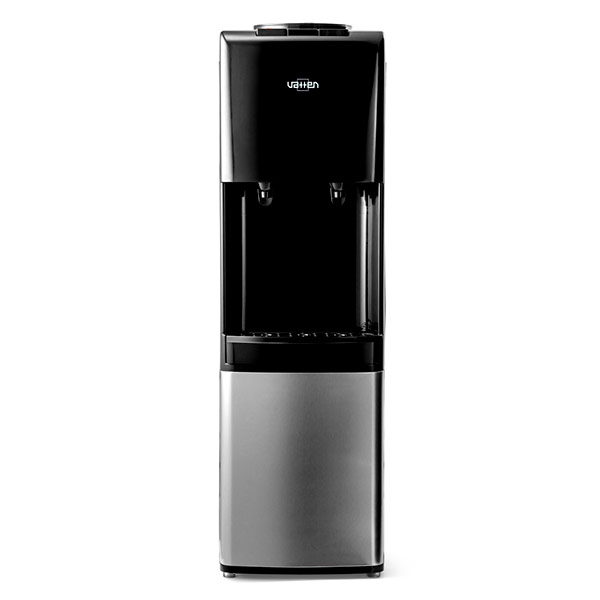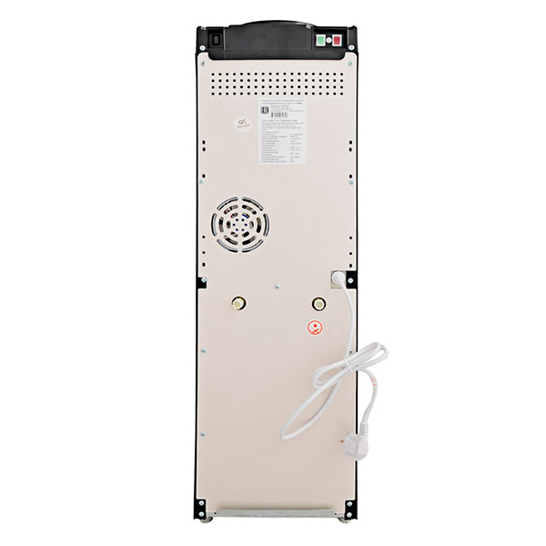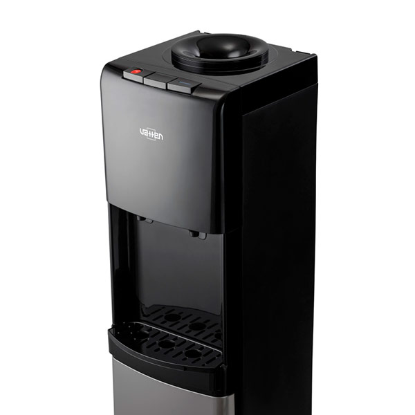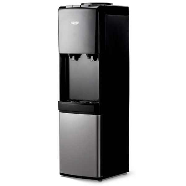 Компактный напольный кулер для воды без охлаждения. Без шкафчика. Современный дизайн. Для дома. Для офиса. Бутылеприёмник, верхняя и передняя панель изготовлены из высококачественного, устойчивого к ультрафиолету ABS пластика чёрного цвета, нижняя панель из нержавеющей стали, боковые панели из пластика чёрного цвета. Два крана, управление кнопками - горячая и холодная вода. Кран горячей воды имеет "защиту от детей". Пригоден для эксплуатации в очень жарком климате - температура эксплуатации кулера от 10 до 38 градусов Цельсия.