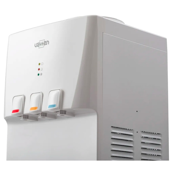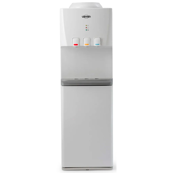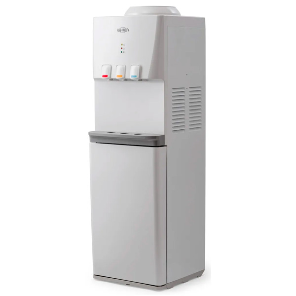 Напольный кулер для воды без шкафчика, без холодильника. Кулер для дома и офиса. Электронное охлаждение (0,6л/ч) + нагрев воды (6л/ч). Цвет белый. Три крана с кнопками. Подходит для домашнего и офисного использования, на предприятиях и учреждениях.
