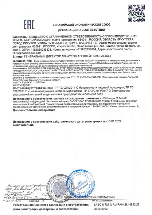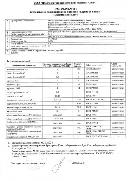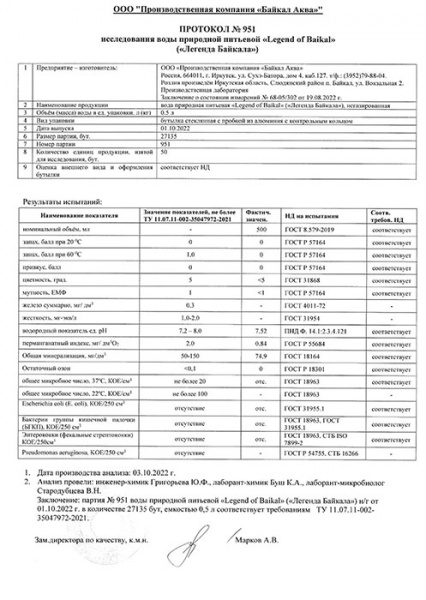 Байкальская глубинная питьевая вода «Легенда Байкала» выпускается на заводе, расположенном на берегу озера Байкал в п. Байкал Слюдянского района Иркутской области. Водозабор осуществляется непосредственно из озера Байкал на удалении 1 500 метров от береговой линии, с глубины более 400 метров из так называемого «ядра» озера, где, по данным ученых, находится вода особой чистоты, не содержащая никаких примесей и не потревоженная цивилизацией. Уникальный химический состав байкальской глубинной воды «Легенда Байкала» придает ей отменный вкус, а содержание минеральных солей тщательно сбалансировано самой природой и суммарно не превышает 0,12 г/л. Вода, добываемая из глубинного водовода, характеризуется стабильными химическими и гидрологическими показателями. Бутылированная питьевая вода, прошедшая водоподготовку (фильтрацию, УФ-облучение) и вода, поступающая из водоводов имеет идентичные химические показатели. Стабильный состав воды по гидрологическим, химическим и микробиологическим показателям обеспечивает без применения консервантов длительное хранение воды без изменения вкусовых и потребительских качеств.