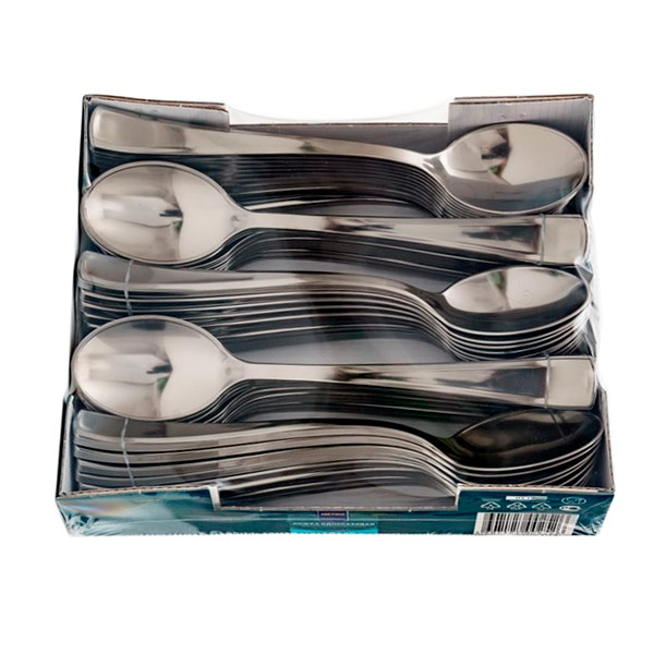Ложки одноразовые металлизированные в упаковке, 50 шт. изготовлены из пластика с металлизированным покрытием сверху. По дизайну они похожи на стальные или алюминиевые. Такие изделия удобно использовать как на пикниках на природе, так и на всевозможных банкетах, торжествах, а также в путешествии. Они имеют презентабельный внешний вид, при этом отличаются прочностью и легкостью. Материал изделия сертифицирован и не наносит вреда здоровью, поэтому его можно использовать как взрослым, так и детям. Такие ложки не подвергаются процессу окисления, не впитывают посторонних запахов и не нуждаются в мытье. Комфортная упаковка позволяет без труда их хранить или транспортировать в нужное место.