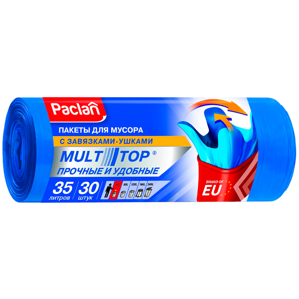 Мешки мусорные Paclan Multitop 35 л, 30 шт. представлены в виде рулона. Компактная упаковка не занимает много места при хранении. Для удобства использования каждый пакет отделен от последующего при помощи перфорации. Мешки легко отрываются друг от друга, сохраняя целостность. Завязки выполнены в виде четырех ушек из единого куска полиэтилена, из того же материала, что и пакет. После его наполнения ушки нужно завязать крест-накрест. Донный шов Звезда выдержит большой вес, т. к. он создан из восьми спаянных слоев полиэтилена. Пакет выдерживает бытовой мусор и не рвется при попытке его завязать. Такие изделия могут использоваться в быту, государственных учреждениях, офисах. Срок годности не ограничен. Рулон необходимо хранить в сухих помещениях на расстоянии не менее 1 м вдали от приборов отопления и прямых солнечных лучей.