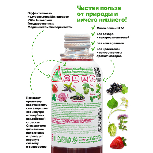 Снижает эмоциональное напряжение и приводит нервную систему в равновесие, При регулярном употреблении помогает организму восстановиться и защищает его изнутри от пагубных воздействий стрессов. Функциональные напитки Fitoguru восполняют дефицит рациона питания , укрепляют ваше здоровье благодаря четко выверенной суточной дозы биологически активных веществ от самой природы. Минимальная доля сока и пюре 81%. Не содержит добавленного сахара и сахарозаменителей, красителей, консервантов, искуственных ароматизаторов и красителей, ГМО