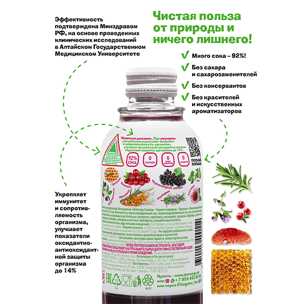 При регулярном употреблении укрепляет иммунитет и сопротивляемость организма, улучшает показатели оксидантно-антиоксидантной защиты организма до 14%.*Клинически доказано на основе проведенных клинических исследований в Алтайском Государственном Медицинском Университете Минздрава РФ. Минимальная доля сока 92%. Не содержит добавленнего сахара и сахарозаменителей,консерватов , исскуственных красителей и ароматизаторов, ГМО