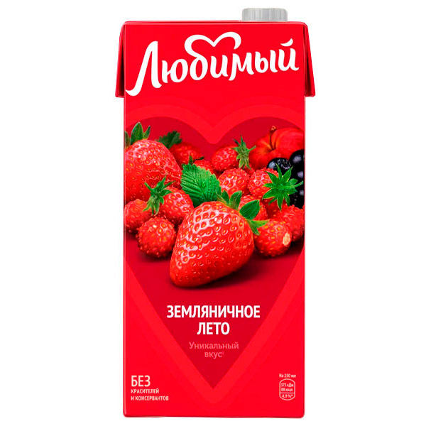 Сок Любимый Земляничное лето – получите удовольствие от вкуса лесных ягод. Изготовлен из натуральных ингредиентов, поэтому подходит для питания детей с 3 лет. Напиток прекрасно утоляет жажду, освежает и дарит прекрасное настроение. Благодаря минимальному содержанию калорий сок может разбавить строгую диету. Современная упаковка тетра-пак состоит из нескольких слоев, чтобы сохранить вкус и свежесть продукта до вашего стола.