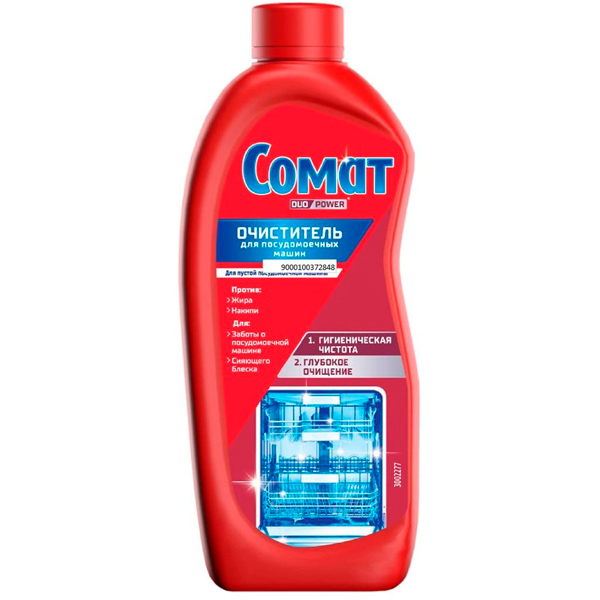 Очиститель для посудомоечной машины Сомат обеспечивает чистоту и идеальное состояние посудомоечной машины, продлевая срок её службы. Интенсивная формула эффективно борется с остатками жира, накипью, неприятным запахом и обеспечивает гигиеническую чистоту внутри Вашей посудомойки. Срок службы посудомоечной машины увеличивается при использовании очистителя каждые три месяца с программой свыше 65C. Просто удалите фольгу с воскового слоя, не открывая крышку и поместите перевернутую вверх дном бутылку в корзинку для столовых приборов в пустую посудомоечную машину. Преимущества Сомат Интенсив Машин Клинер: эффективен против жира, накипи и неприятного запаха; обеспечивает гигиеническую чистоту и сияющий блеск посудомоечной машины; продлевает срок службы посудомоечной машины; удобен в использовании; обладает улучшенной формулой против загрязнений. Используйте Очиститель Сомат не реже 1 раза в 3 месяца для наилучшего результата. А для максимальной чистоты посуды используйте Таблетки Сомат, которые расщепляют остатки пищи и удаляют сложные загрязнения. Пользуйтесь средствами для посудомоечной машины Сомат, чтобы посуда сверкала чистотой, а техника служила долго и надежно!