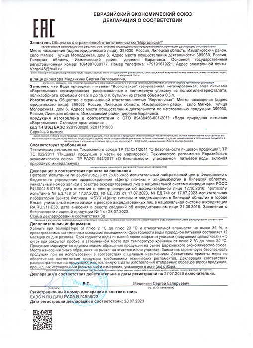 «Воргольская» добывается с 2008 года из собственной скважины. Вода проходит внимательный контроль на всех этапах - от добычи до розлива, включая контроль тары. Производство воды сертифицировано.