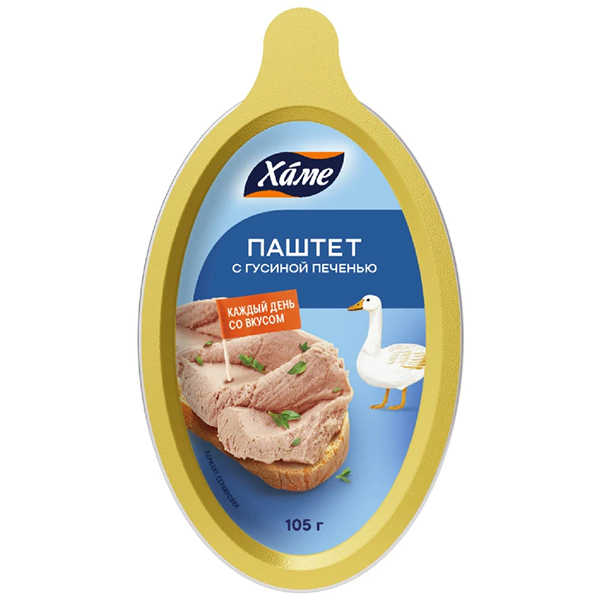 Состав: Вода питьевая; шкурка свиная; мясо свиное механической обвалки; шпик свиной; печень свиная; загуститель Е1412; соль; гидрогенизированный растительный жир; смесь сухих специй; гидролизат растительного белка; пшеничный крахмал; мясной экстракт; сахар; сухое говяжье мясо; загуститель Е1414; смесь посолочно-нитритная (соль, консервант Е250); консерванты (Е262(i), Е262 (ii)); белок животный; стабилизатор Е331; антиокислитель Е316; декстроза; экстракты специй (черный перец, мускатный орех, чеснок); глюкозный сироп; гусиная печень.