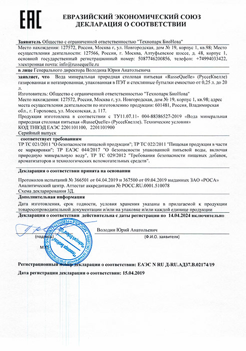 Благодаря сбалансированному минеральному составу из более 150 природных микроэлементов, содержанию уникального минерала молодости Se (селен), гуминовым кислотам – RusseQuelle является главным продуктом здоровой и успешной жизни. Ph (кислотно-щелочной баланс) 7,4 указывает на слабощелочную среду воды, что усиливает её полезные свойства.