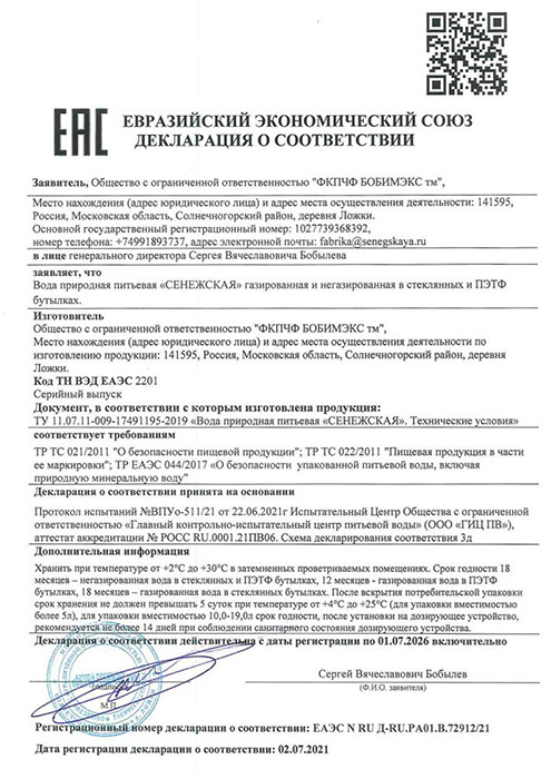 Сенежская - это природная питьевая вода, предназначенная специально для ежедневного потребления и приготовления пищи. Источник питьевой воды Сенежская находится в Солнечногорском районе Московской области на глубине 210 метров, в одном из чистейших ее уголков, вдали от промышленных центров. Процесс формирования источника начался более 145 миллионов лет назад. Миллионы лет с ледникового периода Сенежская хранилась в глубине земли, по крупицам накапливая свои целебные свойства, чтобы вырвавшись на свободу, сохраняя свою чистоту, живительной влагой дать людям здоровье. Благодаря оптимально сбалансированному минеральному составу, вода подходит для людей любого возраста. Сенежская содержит ценные для организма минералы и микроэлементы, способствующие очищению организма от токсинов, шлаков и солей, нормализует процесс пищеварения, регулирует водно-солевой обмен и имунные функции организма. Технология добычи воды Сенежская позволяет сохранить ее природную уникальность и чистоту.