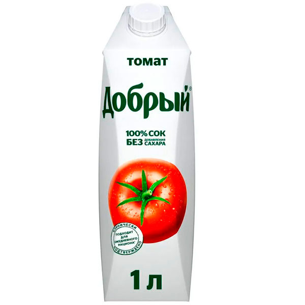 Добрый Томат сок без консервантов и красителей в удобной упаковке для семейного обеда или ужина.