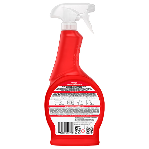 Спрей универсальный Cif ультрабыстрый, 500 мл действует мгновенно, глубоко проникая в самое сердце загрязнений. Чистящее средство содержит натуральное мыло и эффективно растворяет жир, масло, удаляет засохшие и пригоревшие остатки пищи. Просто нанесите небольшое количество спрея на загрязнения и спустя некоторое время смойте водой. Раз-два-три — и готово! Вы увидите чистую, блестящую поверхность без разводов и белых следов. Представьте, даже пятна на ковре и мягкой мебели не устоят перед мощной формулой средства Cif Красный! Можно больше не беспокоиться о дорогостоящей химчистке тканей.Бытовая химия экономно расходуется. Объема бутылки 500 мл хватит на несколько месяцев. Универсальное средство с нашей новой инновационной мягкой формулой подходит для кухни, ванной комнаты и остальной части дома и за его пределами – поистине универсальное средство в линейке Cif.