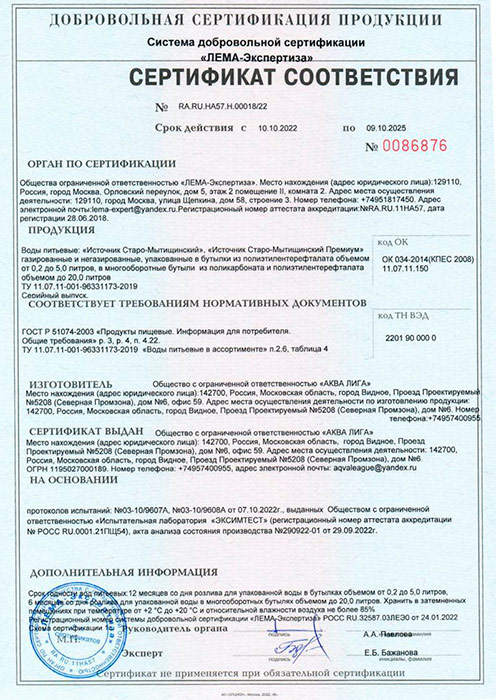 Природная питьевая вода Источник Старо-Мытищинский добывается в экологически чистом районе, из скважины глубиной 110 метров. Очистка и водоподготовка питьевой воды производится на новейшем высокотехнологичном оборудовании "R Bordi". При этом сохраняются все минеральные свойства природной воды.