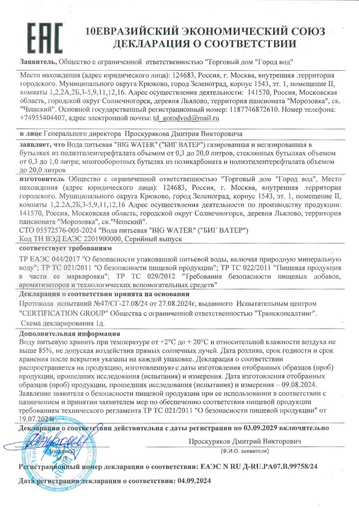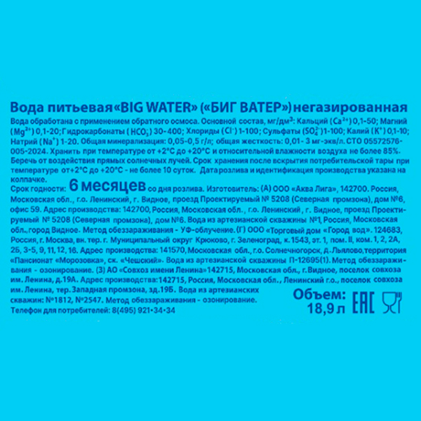 Питьевая вода BIG WATER (БИГ ВАТЕР) добывается из природного источника в экологически чистом районе Подмосковья. Вода отличается сбалансированным составом и мягким вкусом, идеальна для ежедневного потребления.