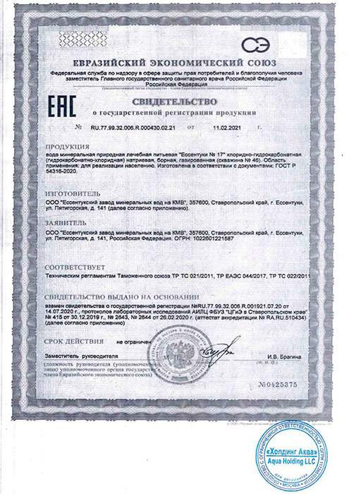 «Ессентуки №?17» — вода минеральная природная лечебная питьевая газированная. Хлоридно-гидрокарбонатная (гидрокарбонатно-хлоридная) натриевая, борная высокой минерализации 10-14 г/л. Обладает насыщенным солоноватым вкусом.
