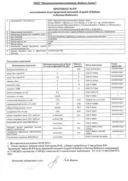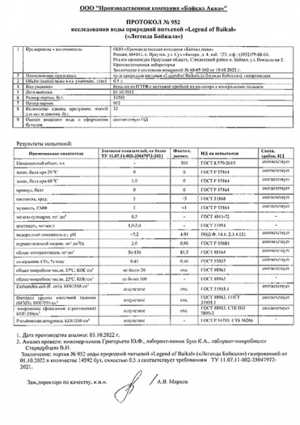 Уникальный химический состав байкальской глубинной воды «Легенда Байкала» придает ей отменный вкус, а содержание минеральных солей тщательно сбалансировано самой природой и суммарно не превышает 0,12 г/л. Вода, добываемая из глубинного водовода, характеризуется стабильными химическими и гидрологическими показателями. Бутылированная питьевая вода, прошедшая водоподготовку (фильтрацию, УФ-облучение) и вода, поступающая из водоводов имеет идентичные химические показатели. Стабильный состав воды по гидрологическим, химическим и микробиологическим показателям обеспечивает без применения консервантов длительное хранение воды без изменения вкусовых и потребительских качеств.