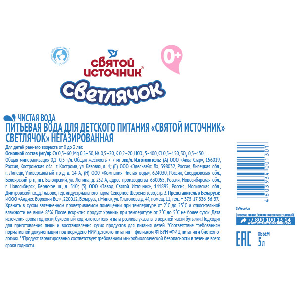 «Святой Источник «Светлячок» содержит важнейшие для здоровья ребенка элементы: кальция, магний, натрий, калий, хлориды, сульфаты, гидрокарбонаты. Идеально подходит для питья и приготовления детского питания. Не требует кипячения и легко растворяет молочную смесь или кашу, сохраняя все полезные свойства.