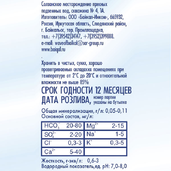 Уникальная байкальская вода «Волна Байкала» добывается на озере Байкал из артезианской линзы образованной сочетанием воды из озера Байкал и талой воды ледников Саянских гор (хребет Хамар-Дабан).