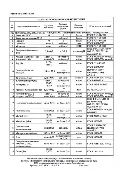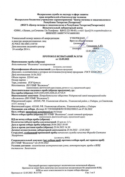 Питьевая вода «Волжанка» высшей категории качества является физиологически полноценной по содержанию основных биологически активных макроэлементов (кальций, магний, бикарбонат, калий и т.д.) и микроэлементов (фтор, бром, бор). Она соответствует «Единым санитарно-эпидемиологическим и гигиеническим требованиям к товарам, подлежащим санитарно-эпидемиологическому надзору (контролю)». По данным института питания РАМН питьевая вода «Волжанка» соответствует требованиям, предъявляемым к воде для детского питания, рекомендована к использованию детям с первого года жизни, в т. ч. для восстановления сухих смесей, а также для питания детей старшего возраста (может употребляться без кипячения).