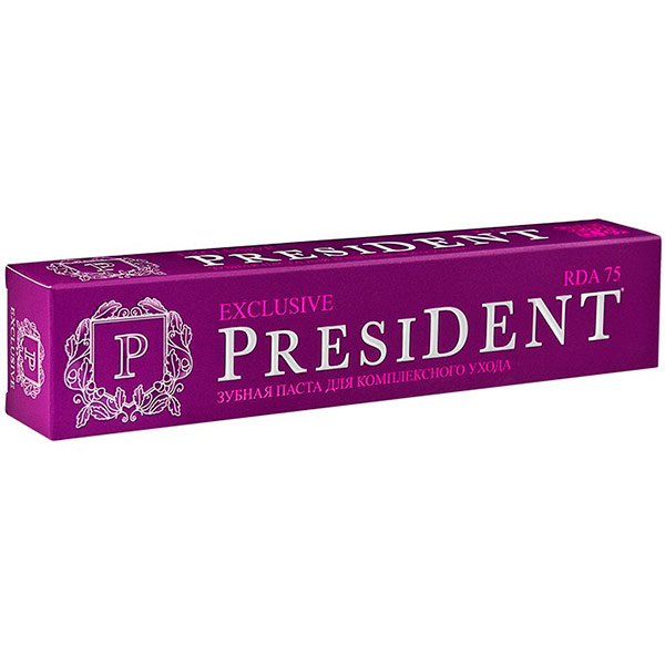 PRESIDENT Exclusive зубная паста тонизирует десны и защищает микрофлору. RDA* - это строгий контроль за размером и концентрацией абразивных частиц. Специально подобранные абразивы безопасно и эффективно удаляют налет, очищают и полируют зубную эмаль. Активные компоненты: Здравоохранения (ВОЗ) и возрастным нормам. Применение: после каждого приема пищи, не менее двух раз в день. Рекомендуется при различных воспалениях полости рта, а также при пониженном иммунитете.